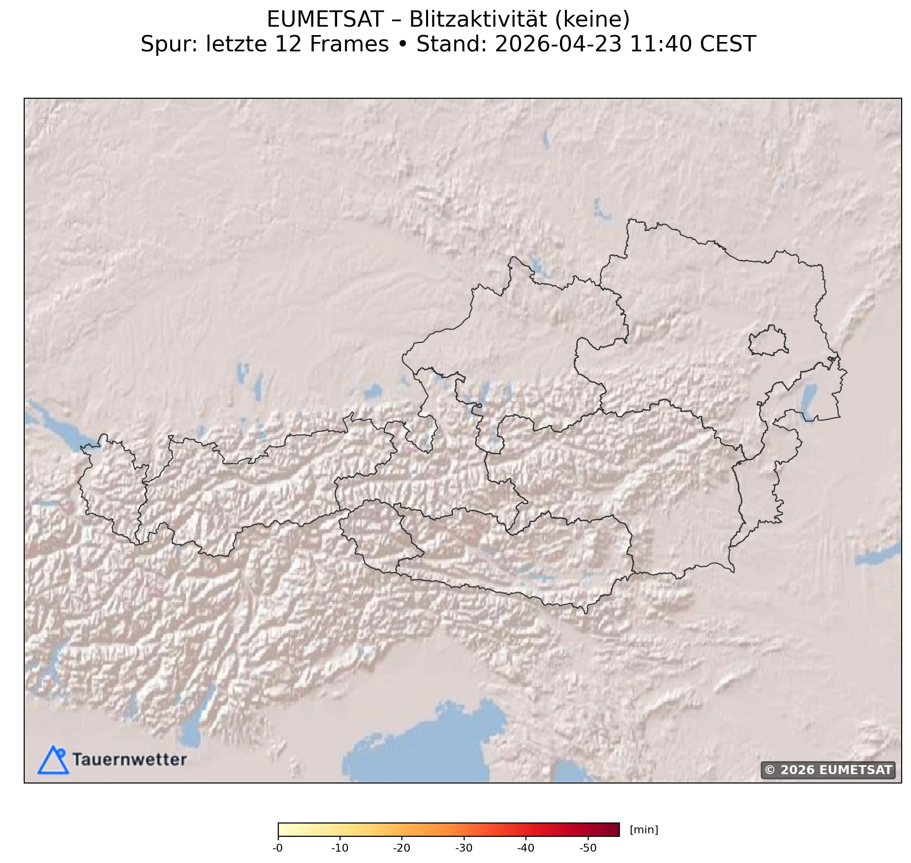 Blitzaktivität (MTG Lightning Imager, 5-Min-Akkumulation) zeigt, wo gerade Blitze fallen — Spur der letzten 12 Frames (≈ 60 Min) mit Farbverlauf: gelb = neu, rot = ältester Frame.