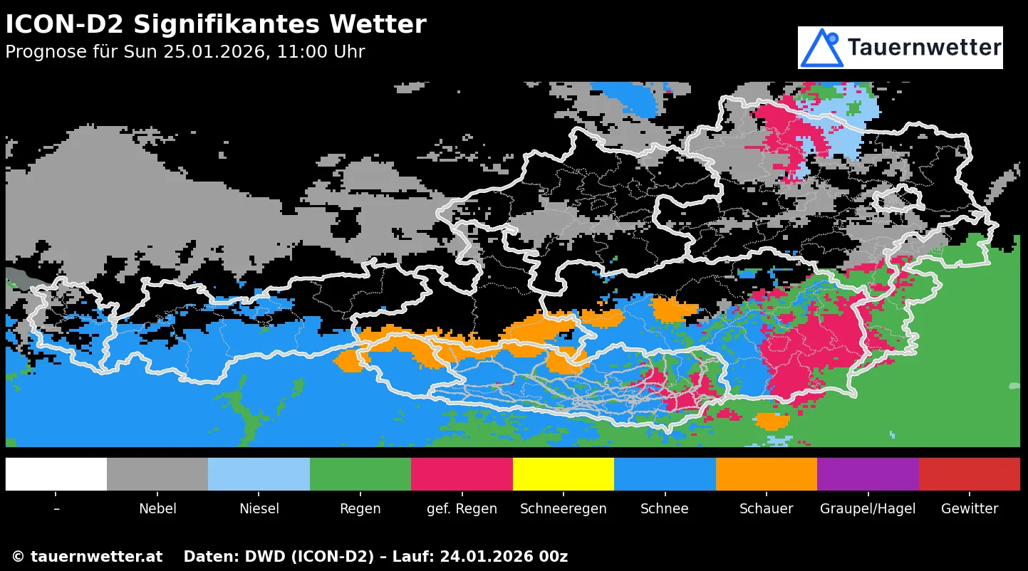 | Sonntag, 25.1. | Dichte Wolken, Regen/Schnee, in Unterkärnten erhöhte Glatteisgefahr, -1 bis 4 °C |