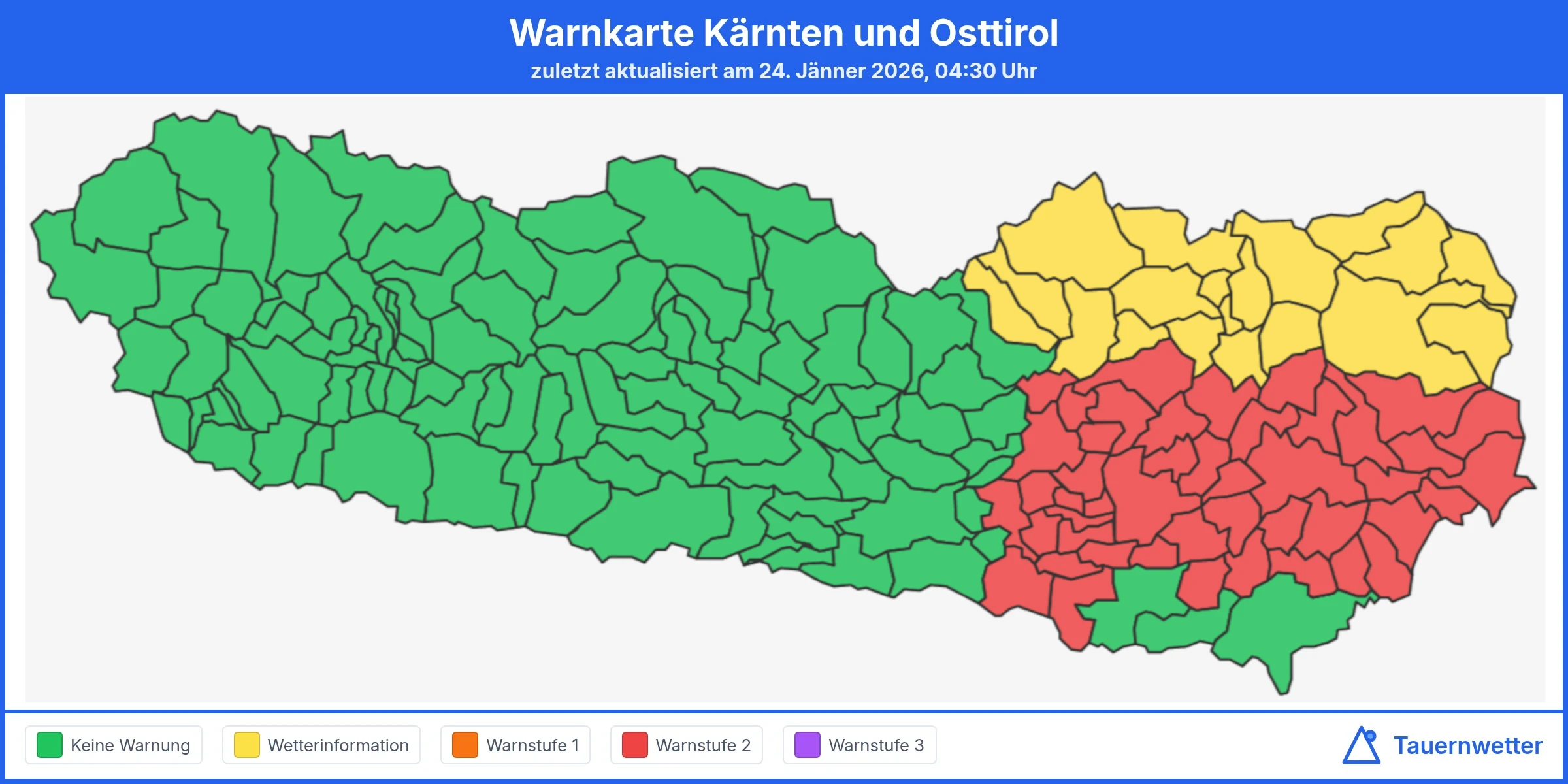 Neben der Glatteisgefahr bringt das Italientief auch teils kräftigen Niederschlag in Oberkärnten und zeitweise intensiven Schneefall in höheren Lagen. Die folgende Warnkarte zeigt die Gesamtübersicht aller aktuellen Wetterwarnungen für Kärnten und Osttirol.