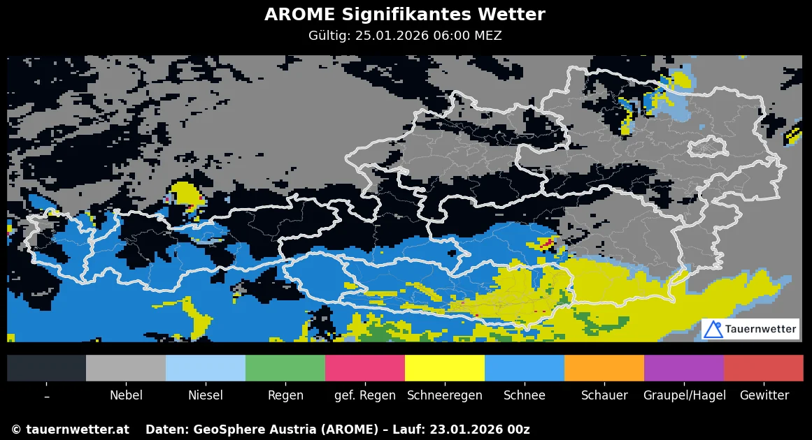 | Sonntag, 25.1. | Wechselhaft, immer wieder Schneefall, unter 900 m auch Regen, 0 bis 5 °C |