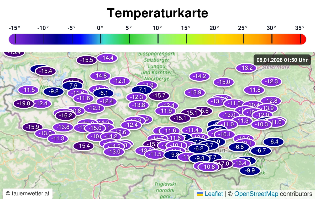 In St. Jakob (-19,8°C vs. -20,0°C) und Lienz (-16,2°C vs. -17,3°C) wurde es hingegen nicht ganz so kalt wie zu Wochenbeginn – leichter Nordwestwind und dünne Schleierwolken verhinderten knapp neue Rekorde.