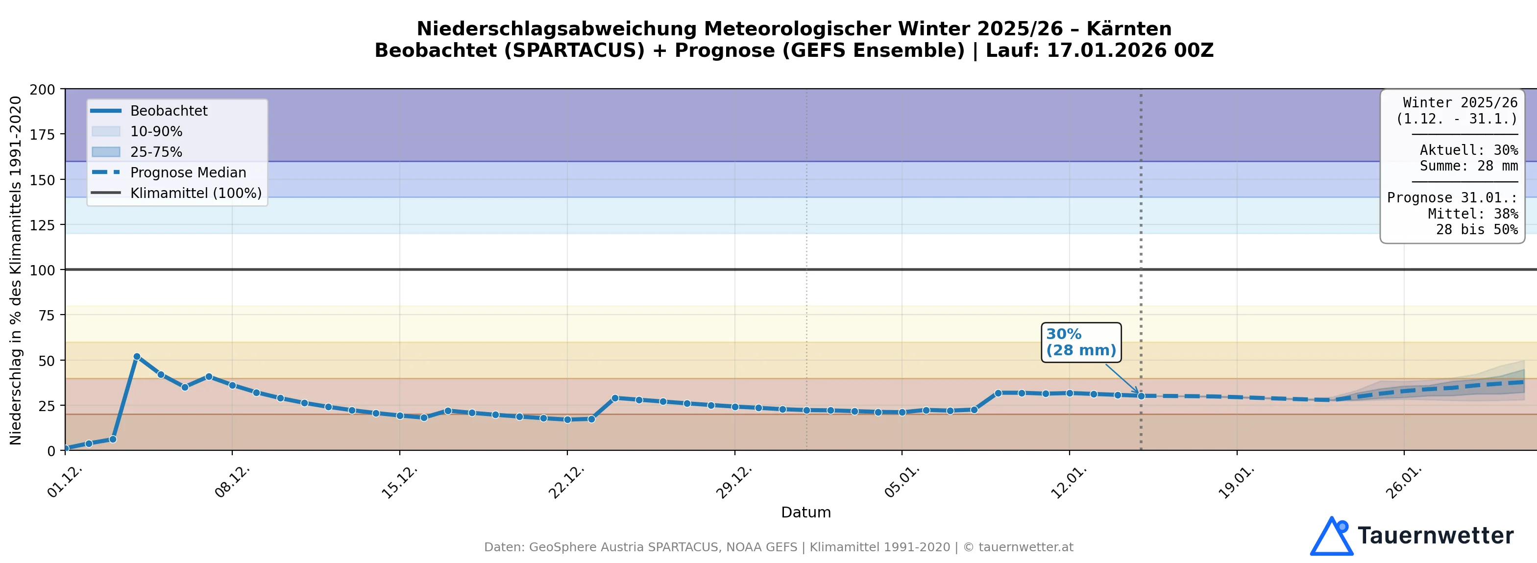 Die Prognose bis Ende Jänner macht wenig Hoffnung: Selbst im günstigsten Fall – bei verbreiteten Niederschlägen von etwa 30 Litern pro Quadratmeter (Wahrscheinlichkeit unter 20 Prozent) – bliebe ein Defizit von minus 50 Prozent für Dezember und Jänner zusammen.