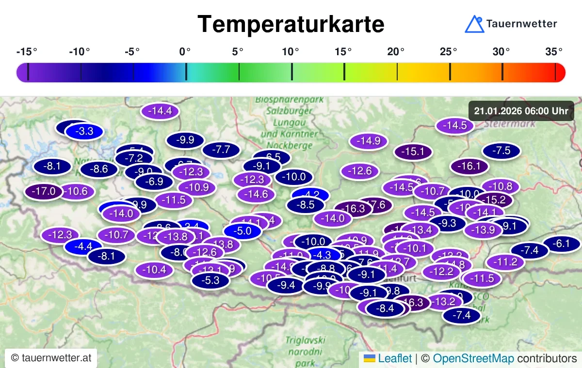 Die Kälte hat sich in der Nacht auf Mittwoch nochmals verschärft. Die Temperaturen sanken verbreitet noch tiefer unter den Gefrierpunkt als in den Nächten zuvor. Den tiefsten Wert meldete einmal mehr das Gurktal: In Weitensfeld wurden minus 17,8 Grad gemessen. Auch in Osttirol war es bitterkalt – in St. Jakob in Defereggen sank das Thermometer auf minus 17 Grad.